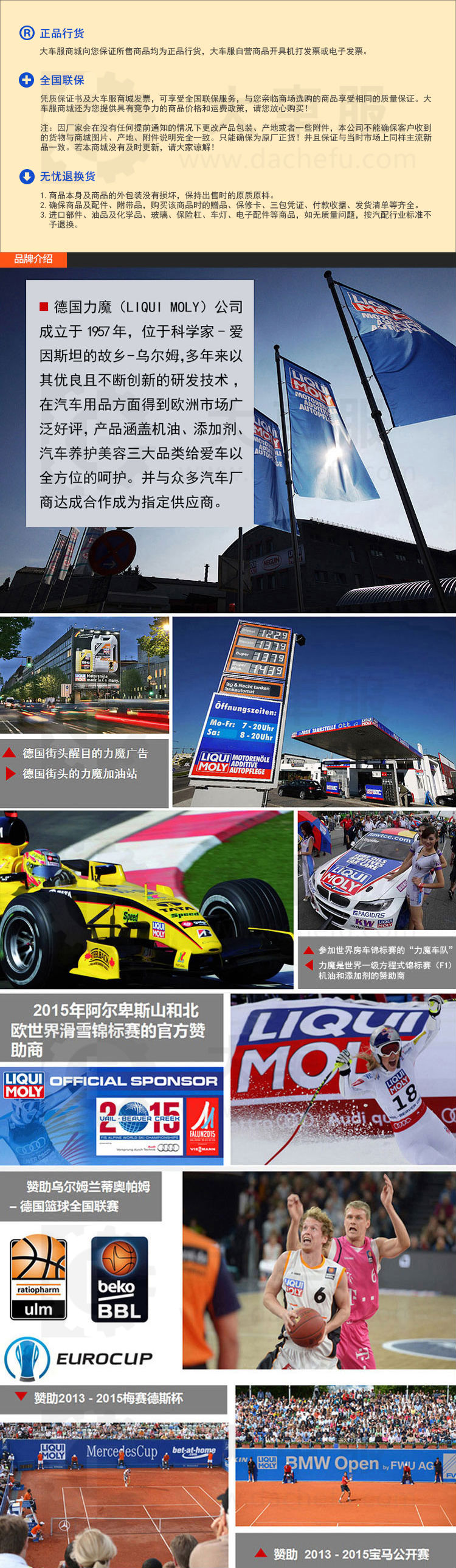 德国力魔(LIQUI MOLY GmbH)是从事润滑油及添加剂的生产制造企业,力魔公司成立于1957年,所在地为德国巴登-符腾堡州的乌尔姆市。德国力魔 LIQUI MOLY 每年都将赢利的大部分投入技术的研发,涵盖了汽车的零部件的养护与维修,获得保时捷、宝马、奔驰、奥迪、大众的的使用许可,德国力魔 LIQUI MOLY 坚持所生产的产品在德国本土生产,同时原材料选择好的基础原料。德国力魔 LIQUI MOLY 值得信赖!